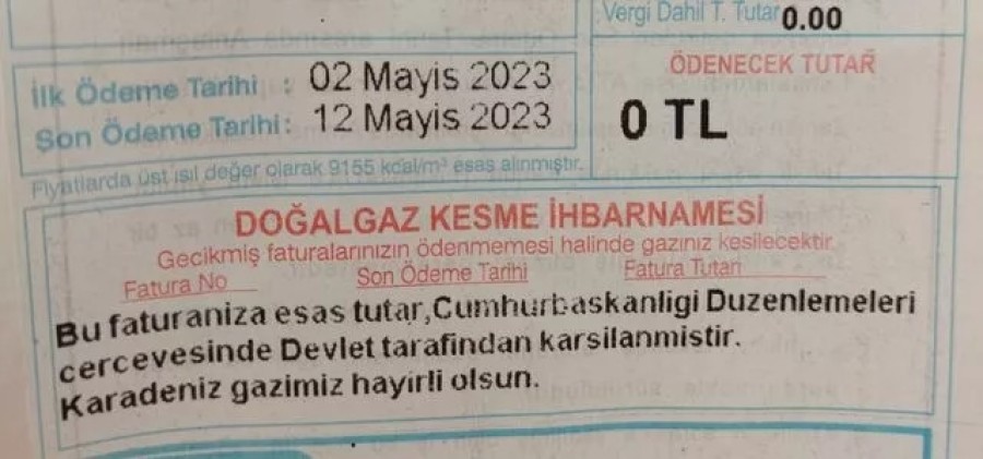 Çorum'un Sungurlu ilçesinde evlere gönderilen doğal gaz faturalarında, "Bu faturanıza esas tutar, Cumhurbaşkanlığı düzenlemeleri çerçevesinde Devlet tarafından karşılanmıştır. Karadeniz gazımız hayırlı olsun" yazısının olduğu görüldü.