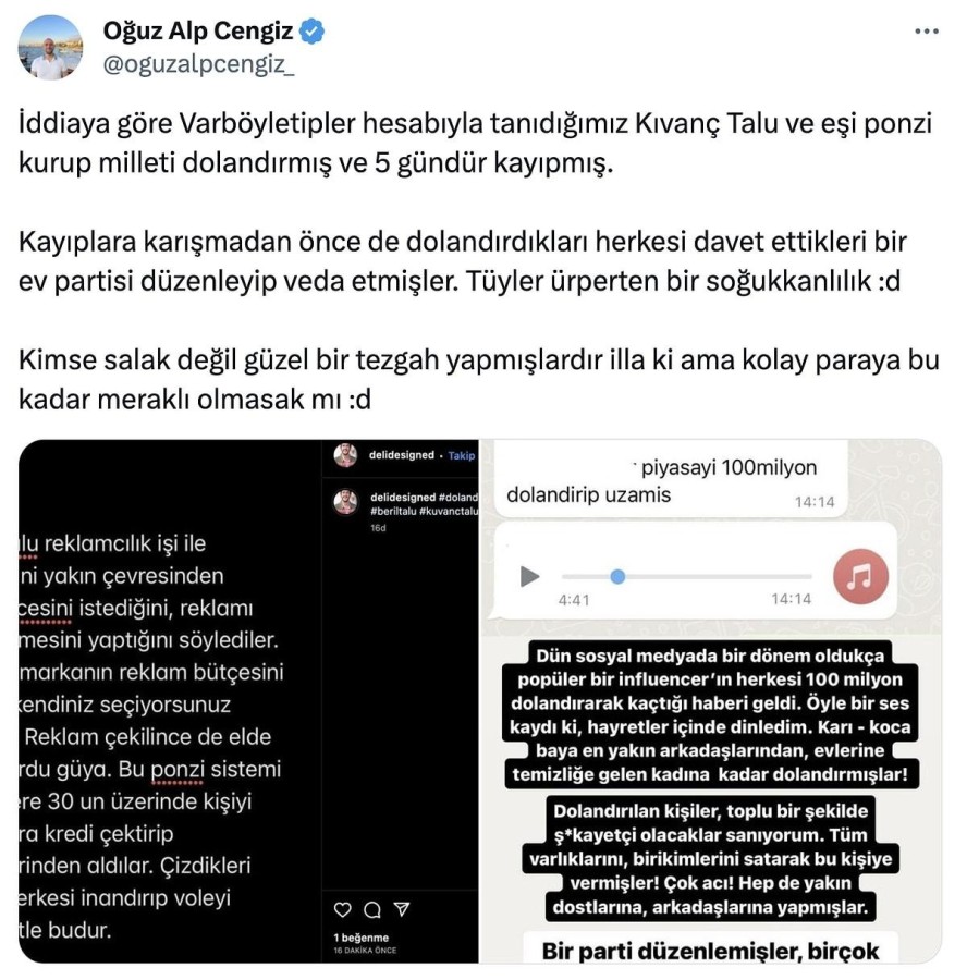 Ünlü bir influencer çiftin insanları dolandırarak kaçtığı iddiası magazin gündeminde resmen bomba etkisi yarattı. Fenomen Kıvanç Talu ve eşi Beril Talu'nun reklam çekmek için bütçe isteyip; topladıkları 100 milyon TL ile yurt dışına kaçtığına dair iddialar dolaşıyor.