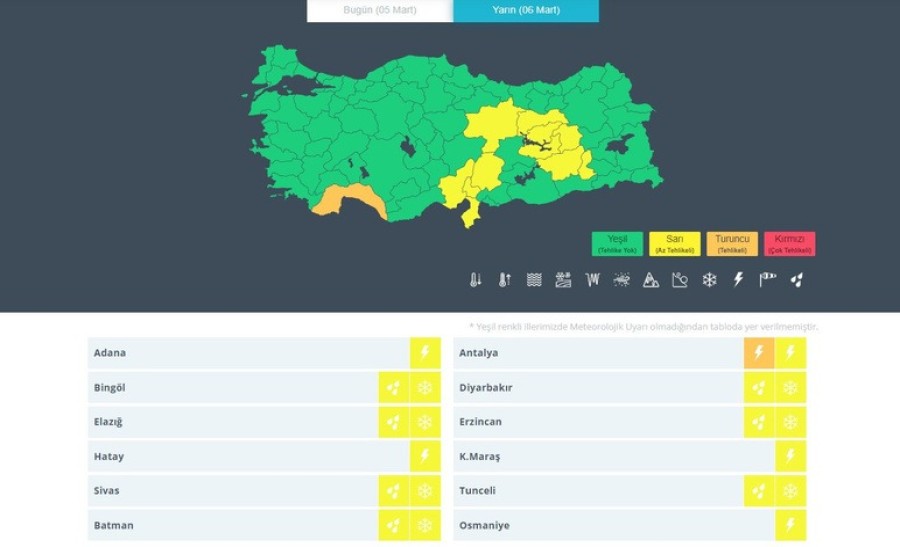 Öte yandan, kuvvetli yağış beklenen Antalya için "turuncu", karla karışık yağmur beklenen Bingöl, Diyarbakır, Elazığ, Erzincan, Sivas, Tunceli, Batman, kuvvetli yağış beklenen Adana, Hatay ve Kahramanmaraş için "sarı" kodlu uyarıda bulunuldu.