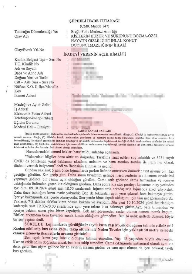Ereğli Cumhuriyet Başsavcılığı tarafından konuya ilişkin soruşturma başlatılırken A.K., verdiği ifadede, E.A.'nın 18 yaşından büyük olduğunu sandığını ifade etti ve "Ben kızın yaşının küçük olduğunu anlamadım. Taytlı bir kızdı, ben aslında bu kızı takip etmedim. Ancak olay anında benim tuvaletim geldi. Merdiven arasına bir yere gittim, açık bir cam tesadüfen gördüm. Baktığımda taytlı kız olduğunu gördüm." ifadesini kaydetti.