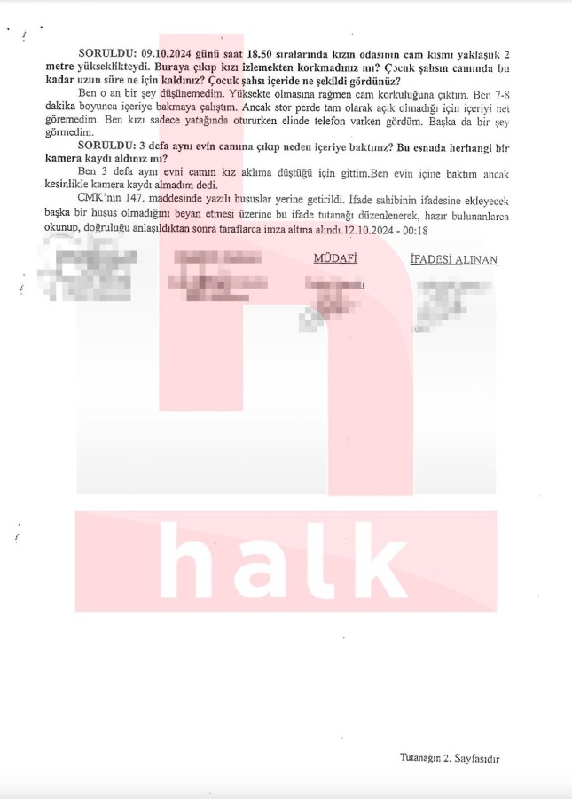 Merakına yenilerek kıza bakmak istediğini fakat kızın perdeyi kapattığını söyleyen A.K., "Birkaç gün sonra bir daha gittim. Arkadaşlarla birlikte alkol alıyorduk. Kızı merak ettim, evine gittim. Cam açıktı, oraya tırmandım. Stor yine kapalıydı aradan baktım. Kızı yatağının üstüne otururken gördüm." söyleminde bulundu.