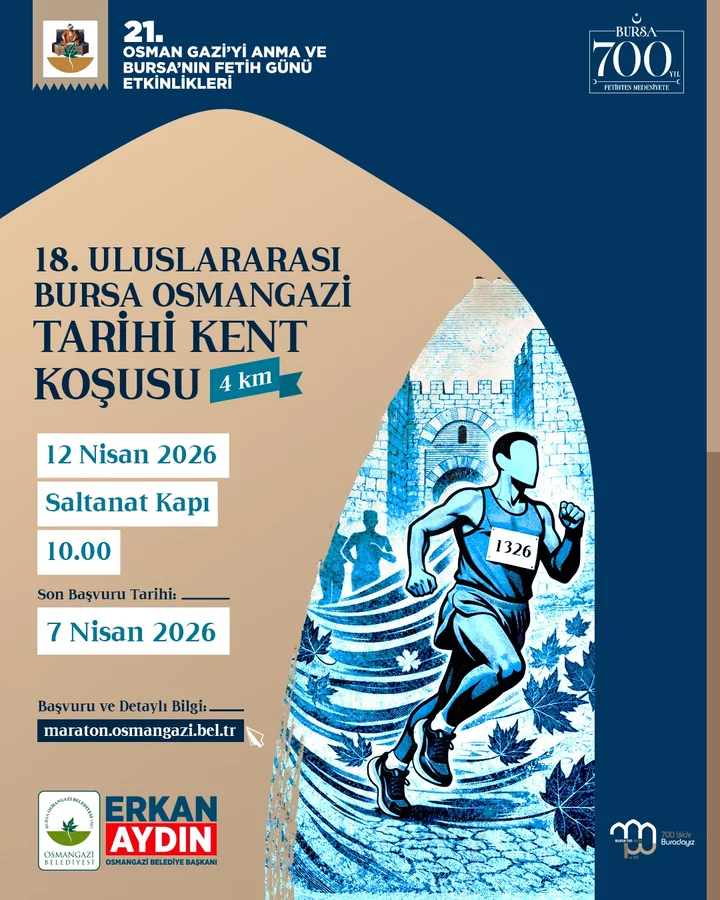 Osmangazi Belediyesi'nin bu yıl 21'incisini düzenlediği "Osman Gazi'yi Anma ve Bursa'nın Fethi Etkinlikleri" kapsamında gerçekleşecek 18. Uluslararası Bursa Osmangazi Tarihi Kent Koşusu, Bursa'nın Fethi'nin 700. Yıl Dönümü ile ayrı bir anlam kazanacak. 4 kilometrelik parkurda gerçekleşecek koşu, Bursa'nın geçmişten günümüze uzanan mirasını sporla bir araya getirecek.
