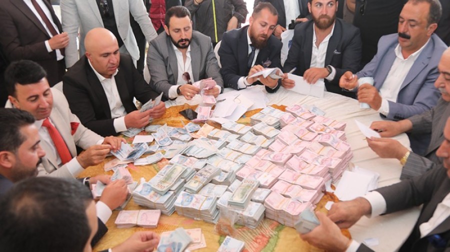 5 saat süren takı merasiminde damada 6 milyon lira, geline yaklaşık 4 kilo altın takıldı. Masanın üzerine konulan paralar ise 10 kişi tarafından sayıldı.
