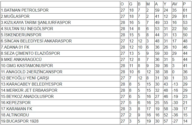 Beyaz Grup'ta haftayı bay geçen Batman Petrolspor, 61 puan ve averajla zirvedeki yerini korudu.