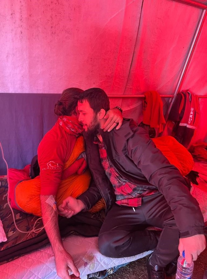 Kahramanmaraş'ta yerle bir olan 7 katlı Aktaş Apartmanının enkazında 3 çocuğunu kaybedip eşi ile birlikte 203 saat sonra canlı kurtarılan Muharrem Polat tedavi olduğu hastaneden taburcu olduktan sonra serum takılan kurtarıcısını çadırda ziyaret etti.