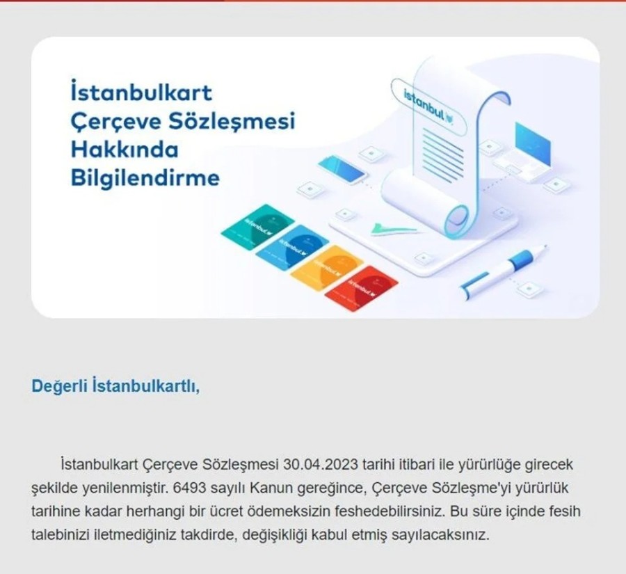 Sözleşmeyle ilgili vatandaşları bilgilendiren Belbim gönderdiği maillerde; "İstanbulkart Çerçeve Sözleşmesi 30.04.2023 tarihi itibari ile yürürlüğe girecek şekilde yenilenmiştir. 6493 sayılı Kanun gereğince, Çerçeve Sözleşme'yi yürürlük tarihine kadar herhangi bir ücret ödemeksizin feshedebilirsiniz. Bu süre içinde fesih talebinizi iletmediğiniz takdirde, değişikliği kabul etmiş sayılacaksınız" ifadelerine yer verildi.