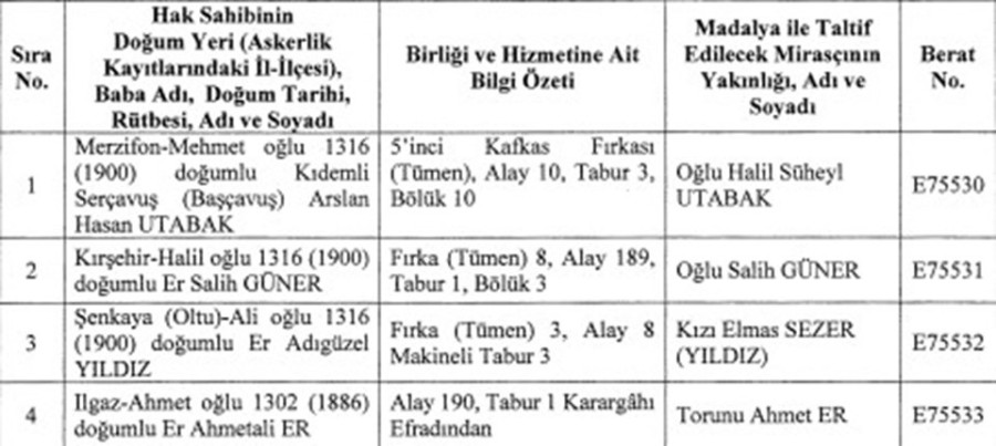 Cumhurbaşkanı Recep Tayyip Erdoğan'ın imzasıyla yayımlanan karara göre, İstiklal Madalyası Kanunu gereğince Kurtuluş Savaşı'ndaki hizmetleri tespit edilen 4 gazinin mirasçılarına İstiklal Madalyası verilecek.