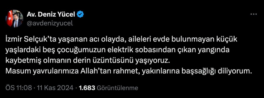 CHP Parti Sözcüsü Deniz Yücel, İzmir'in Selçuk ilçesine bağlı Cumhuriyet Mahallesi'nde elektrikli sobadan çıkan yangında 5 çocuğun can vermesine ilişkin sosyal medya hesabından açıklama yaptı. Yücel, X hesabından yaptığı açıklamada şu ifadeleri kullandı: