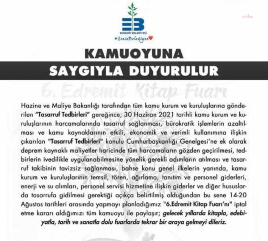 Belediye tarafından yapılan açıklamada, "'Tasarruf Tedbirleri' konulu Cumhurbaşkanlığı Genelgesi'ne ek olarak deprem kaynaklı maliyetler haricinde tüm harcamaların gözden geçirilmesi, tedbirlerin ivedilikle uygulanabilmesine yönelik gerekli adımların atılması ve tasarruf takibinin tavizsiz sağlanması, bahse konu genel ilkelerin yanında, kamu kurum ve kuruluşlarının temsil, tören, ağırlama, tanıtım ve personel giderleri, enerji ve su alımları, personel servisi hizmetine ilişkin giderler ve diğer hususlarda tasarrufa gidilmesi gerektiği açıkça belirtilmiş olduğundan bu sene 14-20 Ağustos tarihleri arasında yapmayı planladığımız "6.Edremit Kitap Fuarı'nı" iptal etme kararı aldığımızı tüm kamuoyu ile paylaşıyoruz" ifadeleri kullanıldı.