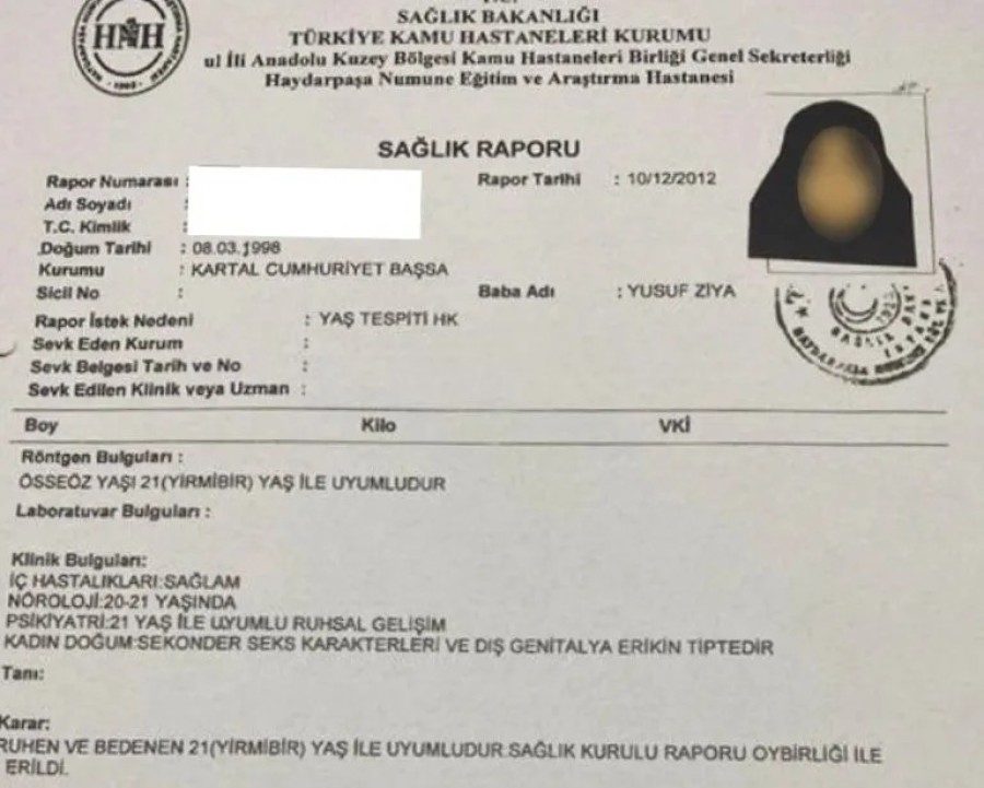 Dava dosyasına giren 2012 tarihli yaş tespiti raporu ortaya çıktı. Raporda H.K.G.'nin doğum tarihi 8 Mart 1998 olarak belirtiliyor. Rapor tarihinde 14 yaşında olduğu görülen H.K.G.'ye ruhen ve bedenen 21 yaş ile uyumlu olduğu değerlendirmesi yapılıyor. Oy birliğiyle verilen raporda, iç hastalıkları sağlam, nöroloji 21 yaşında, psikiyatri 21 yaş ile uyumlu ruhsal gelişim, kadın doğum sekonder seks karakterleri ve dış genitalya erikin tiptedir tespitleri yer aldığı görülüyor.
