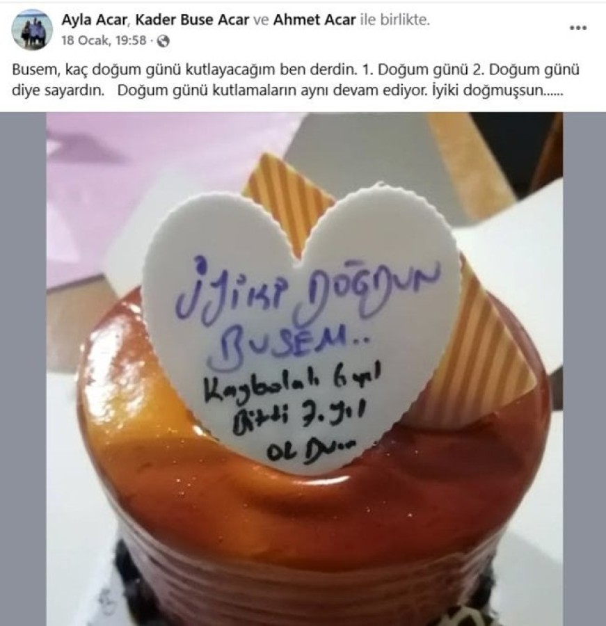 Ayla Acar, kızının 19 Ocak'taki doğum gününde de üzerinde "İyi ki doğdun Busem. Kaybolalı 6 yıl bitti, 7 yıl oldu" notunun bulunduğu bir yaş pasta paylaşımı yapmıştı.