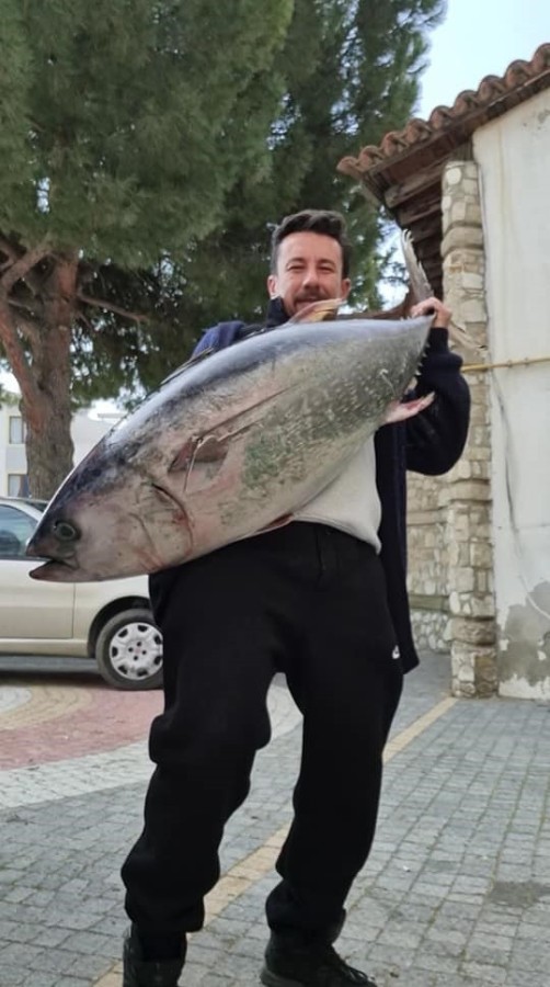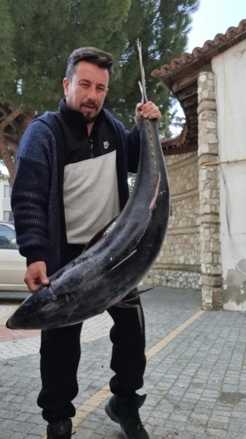 Balıkesir'in Edremit ilçesinde bir balıkçı, olta ile 63 kiloluk dev orkinos yakaladı.