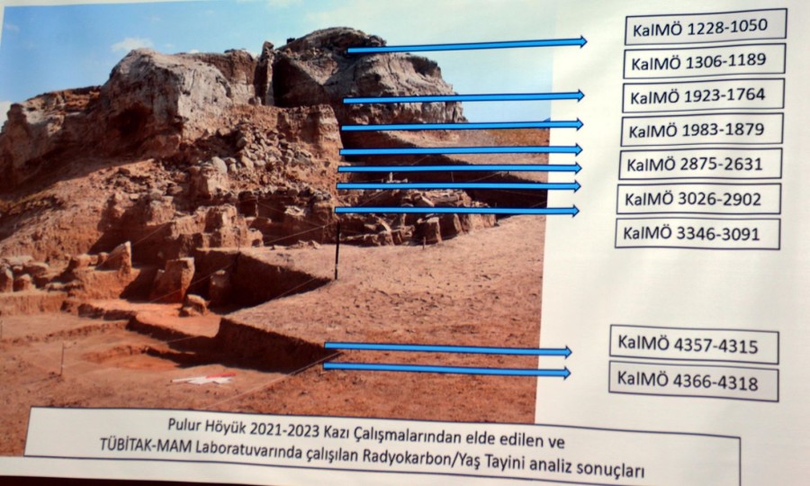 Çalışmaların halen yürütülmekte olduğu Pulur Höyük'te şimdilik 7 tabakayı ortaya çıkardığımız kazılarda; en üstte Orta Çağ tabakası, onun altında Geç Tunç Çağı/Erken Demir Çağı, Erken Tunç Çağı III/Orta Tunç Çağı, Erken Tunç Çağı II, Erken Tunç Çağı I, Geç Kalkolitik Çağ ve Orta Kalkolitik Çağ tabakaları yer almaktadır" dedi.