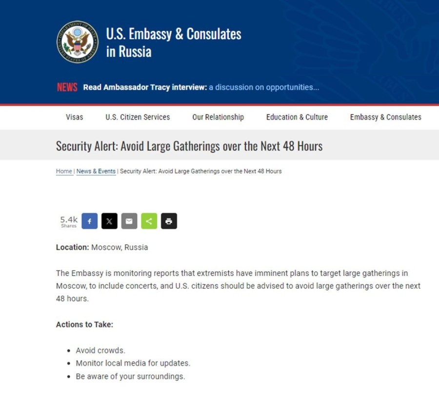 Cuma akşamı Rusya'nın başkenti Moskova'daki bir konser salonunda silahlı saldırı gerçekleşti. Konser salonunun bulunduğu Crocus City Hall binasında patlama yaşandığı ve patlama nedeniyle yangın çıktığı bildirildi. Rusya Soruşturma Komitesi tarafından, terör saldırısında hayatını kaybedenlerin sayısının 133'e ulaştığı açıklandı. Saldırıyı terör örgütü DAEŞ üstlendi. Terör saldırısından sorumlu olduğu iddia edilen 11 şüpheli gözaltına alındı. Bunlardan dördünün doğrudan olaya karıştığı belirlendi. Saldırı faillerinin Rusya-Ukrayna sınırında yakalandığı ve Ukrayna tarafında bağlantıları bulunduğu kaydedildi.