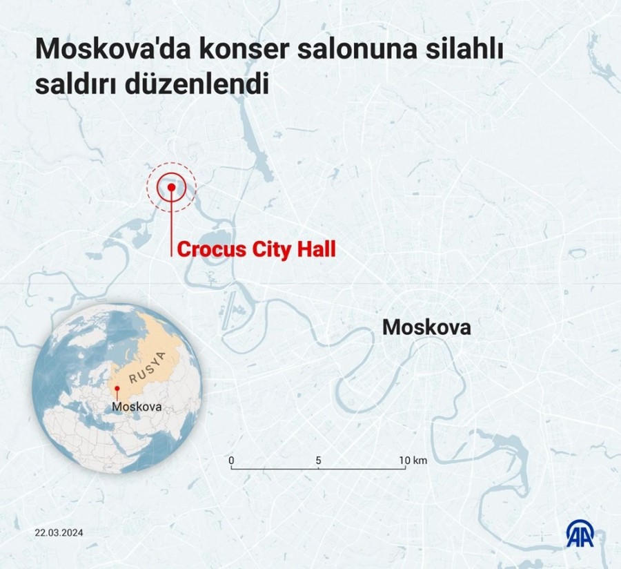 22 Mart 2024 akşamı Rusya'nın başkenti Moskova'daki Crocus City Hall konser salonunda silahlı saldırı gerçekleşti.