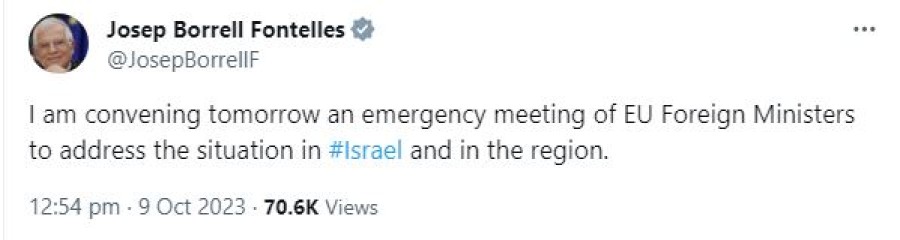 Avrupa Birliği Dışişleri ve Güvenlik Politikaları Yüksek Temsilcisi Josep Borrell, sosyal medya hesabından yaptığı açıklamada, "İsrail ve bölgedeki durumu ele almak üzere yarın AB Dışişleri Bakanlarını acil bir toplantıya çağırıyorum" dedi.