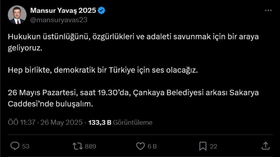 Ankara Büyükşehir Belediye (ABB) Başkanı Mansur Yavaş, Ekrem İmamoğlu'na destek için de kullandığı sosyal medya hesabından miting çağrısı yaptı.