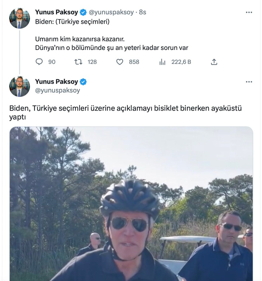 Paksoy, Biden'ın Türkiye seçimleri üzerine açıklamasına bisiklet binerken ayaküstü yaptığını belirtti.