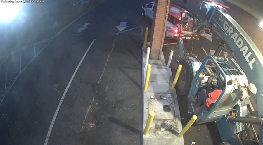 Bir kişi forklift kullanırken, diğeri beyaz bir kamyonet kullanıyordu. Forklifti kullanan şüpheli, ATM'yi platformun üzerinden devirdikten sonra makineyi kamyonetin kasasına yükledi.