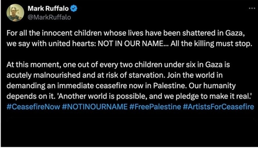 Ruffalo, sosyal medya hesabından, "Gazze'de hayatları paramparça olan tüm masum çocuklar için tek yürek olarak diyoruz ki bizim adımızı kullanmayın. Tüm ölümler durmalıdır" paylaşımında bulundu.
