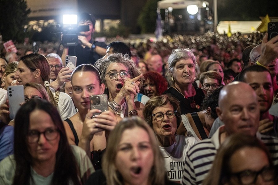Netanyahu'nun adı her geçtiğinde tepki gösteren kalabalık, Netanyahu karşı protestolarda sıkça kullanılan "utan, utan, utan" şeklinde İbranice slogan attı.
