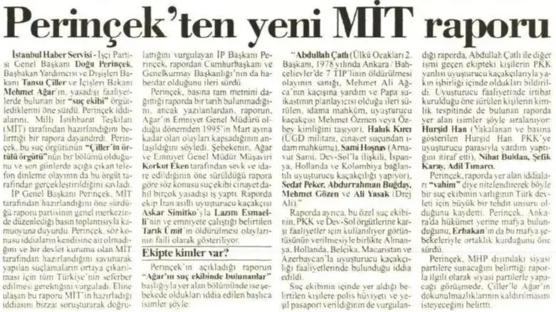 Özellikle eski başbakan Tansu Çiller ve eski içişleri bakanı Mehmet Ağar hakkında önemli ifadeler içeren rapor, "Emniyet Genel Müdürlüğü'nce PKK ve Dev-Sol'a karşı faaliyetler için kullanılıyor görüntüsü ile özel bir suç ekibi teşkil edilmiştir" cümlesiyle başlıyordu.