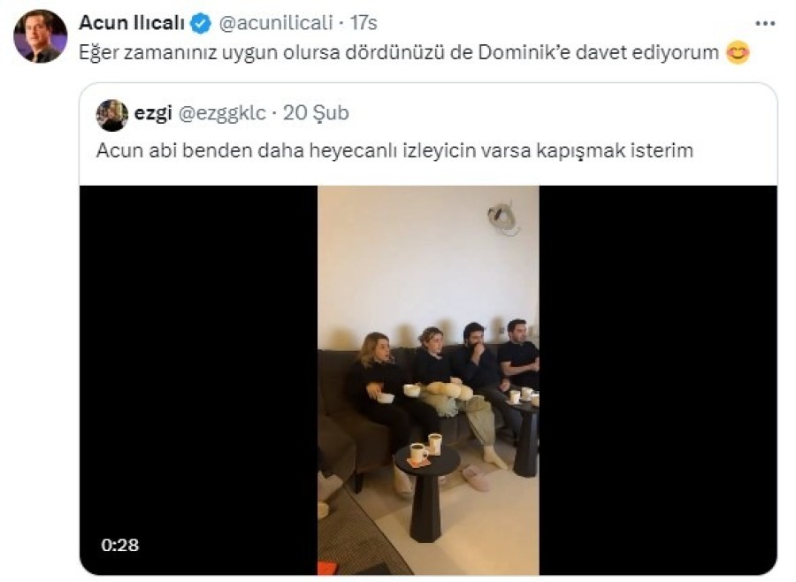 Sosyal medyada hızla yayılan videoya sessiz kalamayan Acun Ilıcalı ise "Eğer zamanınız uygun olursa dördünüzü de Dominik'e davet ediyorum" ifadelerini kullandı. Ilıcalı'nın daveti karşısında şaşkına uğrayan genç avukat ise "Geliyoruz" karşılığını verdi.