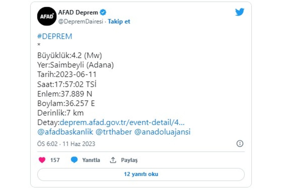 Afet ve Acil Durum Yönetimi (AFAD) Başkanlığı'nın sitesinde yer alan bilgiye göre, Adana'nın Saimbeyli ilçesinde 4,2 büyüklüğünde deprem meydana geldi.