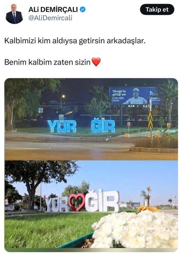 Adana'daki olay, dün gece saatlerinde Yüreğir ilçesindeki Serinevler Parkı'nda meydana geldi. Belediyeye ait Yüreğir yazılı logonun ortasına 'E' harfi yerine yerleştirilen kalp, kimliği belirsiz kişi veya kişiler tarafından çalındı. Kalbin yerinde olmadığını görenler, cep telefonlarıyla görüntüleyerek sosyal medyada paylaştı. Belediye Başkanı Ali Demirçalı da sosyal medya hesabından yaptığı paylaşımda, "Kalbimizi kim aldıysa getirsin arkadaşlar. Benim kalbim zaten sizin" dedi. Olayı kimin gerçekleştirdiğinin belirlenmesi için çalışma başlatıldı.