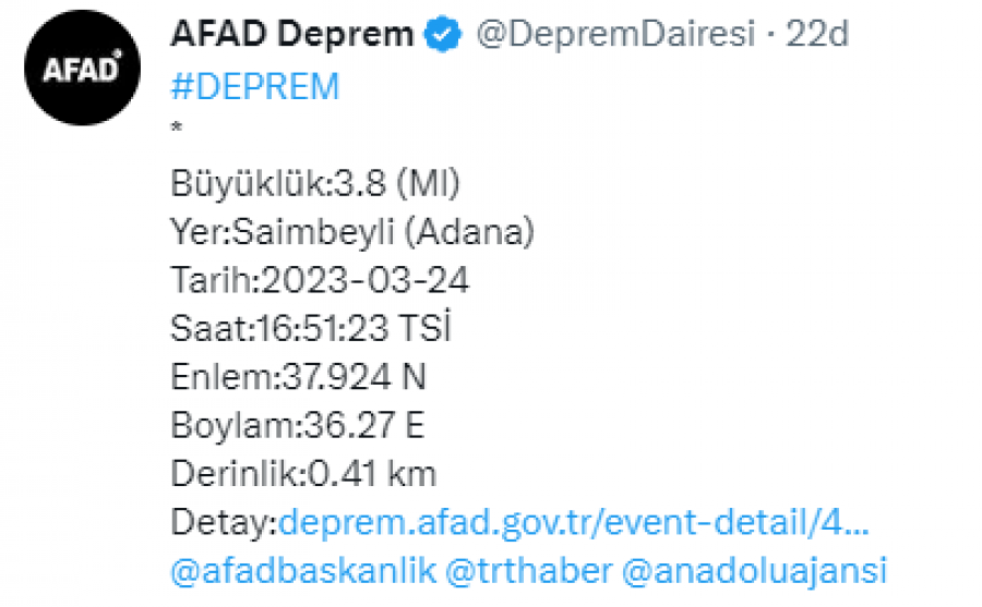AFAD'dan edinilen bilgiye göre, saat 16.10 sıralarında Adana Saimbeyli ilçesinde 3.8 büyüklüğünde deprem meydana geldi.