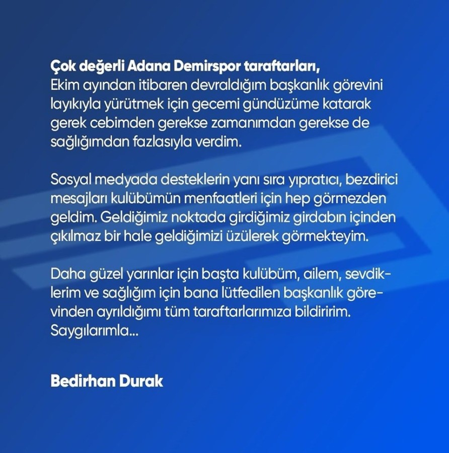 Adana Demirspor Kulübü Başkanı Bedirhan Durak, sosyal medyadan yaptığı açıklamada görevinden istifa ettiğini duyurdu.