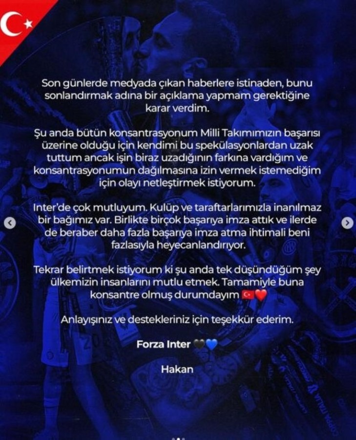 Sosyal medya hesabından açıklama yapan Hakan Çalhanoğlu, takımı Inter'de yola devam edeceğini yazdı.