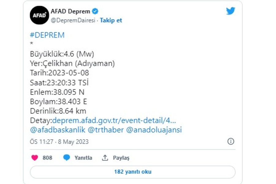 AFAD'ın internet sitesinde yer alan bilgiye göre, Çelikhan'da 4,6 büyüklüğünde deprem oldu.