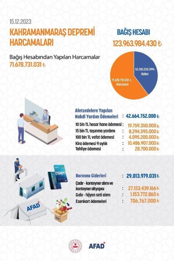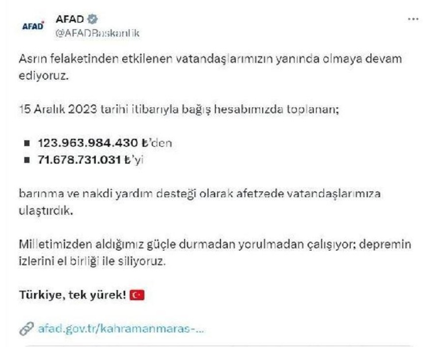 15 Aralık 2023 tarihi itibarıyla bağış hesabımızda toplanan; 123 milyar 963 milyon 984 bin 430 TL'den 71 milyar 678 milyon 731 bin 31 TL'yi barınma ve nakdi yardım desteği olarak afetzede vatandaşlarımıza ulaştırdık. Milletimizden aldığımız güçle durmadan, yorulmadan çalışıyor; depremin izlerini el birliği ile siliyoruz. Türkiye, tek yürek" denildi.