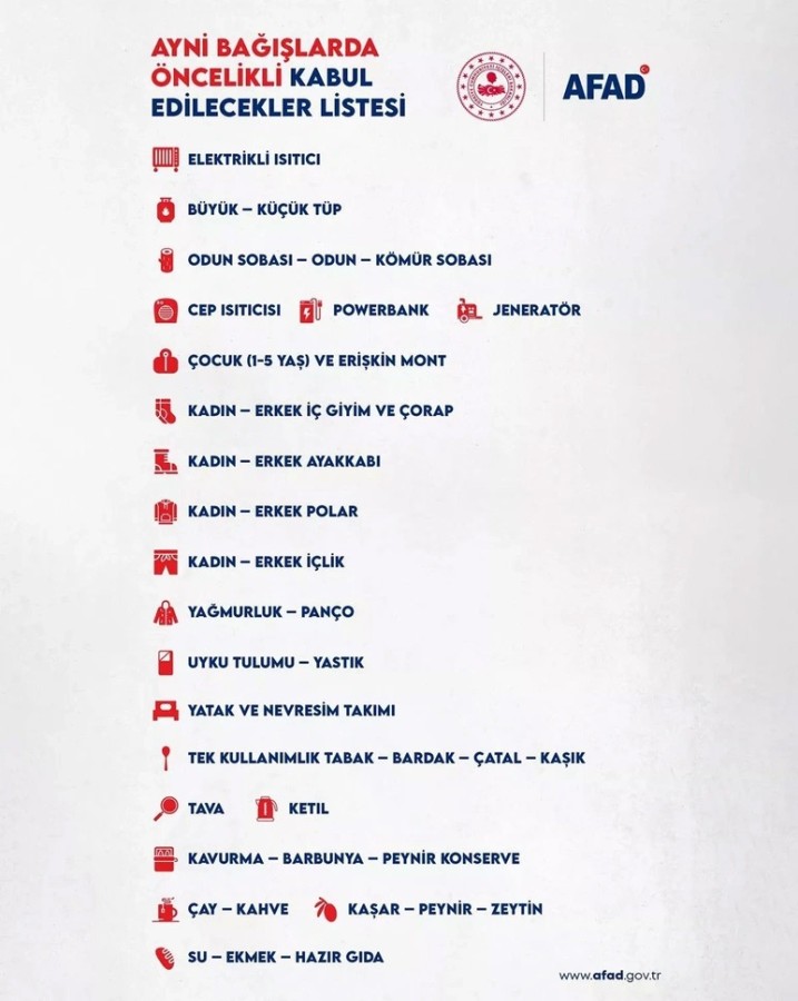 Kahramanmaraş merkezli meydana gelen 7,7 ve 7,6 büyüklüğündeki depremlerin yaraları sarılıyor. Başlatılan yardım kampanyalarına vatandaşların destekleri artarken AFAD da ayni bağışlarda öncelikli kabul edilecekler listesini yayınladı.