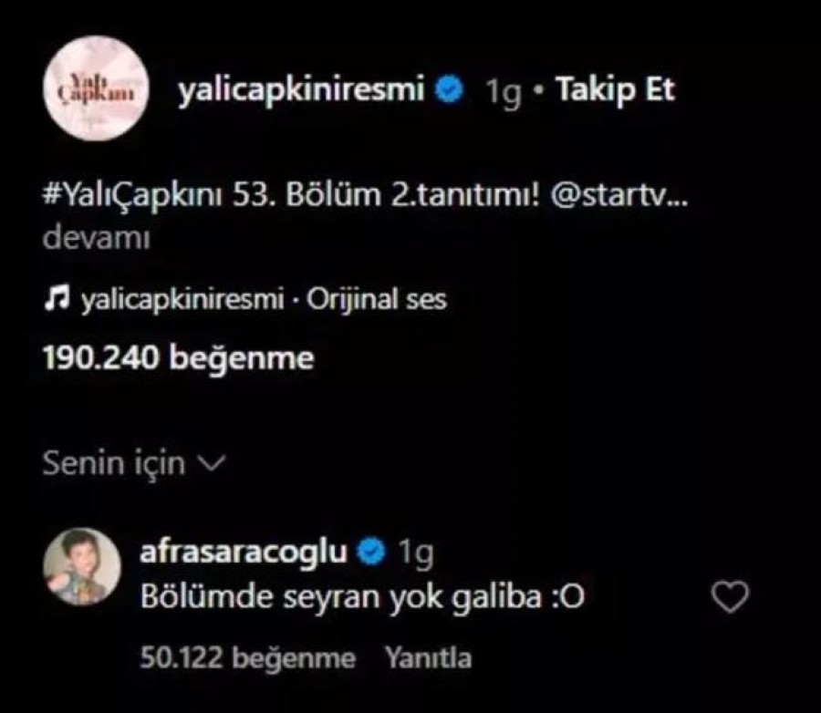 Afra Saraçoğlu son olarak Yalı Çapkını'nın yeni bölüm fragmanının altına yazdığı yorumla çok konuşuldu.