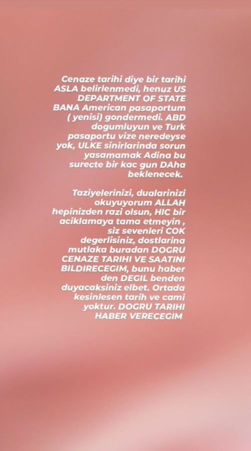 Anjelik Calvin, "Cenaze tarihi diye bir tarih asla belirlenmedi. Henüz US Department Of State yeni Amerikan pasaportumu göndermedi. ABD doğumluyum ve Türk pasaportum vizem neredeyse yok. Ülke sınırlarında sorun yaşamamak adına bu süreçte birkaç gün daha beklenecek. Taziyeleriniz, dualarınızı okuyorum. Allah hepinizden razı olsun. Hiçbir açıklamaya itibar etmeyin. Siz sevenleri çok değerlisiniz. Dostlarına mutlaka buradan doğru cenaze tarihini ve saatini bildireceğim. Bunu haberden değil, benden duyacaksınız elbet. Ortada kesinleşen tarih ve cami yoktur. Doğru tarihi haber vereceğim" ifadelerini kullandı.