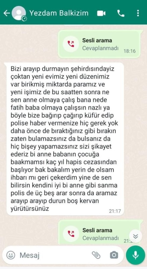 Ailelerinin ulaşmaya çalıştığı kızlardan Selin Yezdanur, annesi Rukiye Çolak'a Whatsapp'tan, "Bizi arayıp durmayın şehir dışındayız. Çoktan yeni evimiz, yeni düzenimiz, birikmiş miktarda paramız ve yeni işimiz de var. Bu saatten sonra ne sen anne olmaya çalış bana ne de Fatih baba olmaya çalışsın. Nazlı'ya da böyle bize bağırıp, çağırıp küfür edip polise haber vermenize hiç gerek yok. Daha önce de bıraktığınız gibi bırakın. Zaten bulamazsınız da bulsanız da hiçbir şey yapamazsınız. Sizi şikayet ederiz. Bir anne, babanın çocuğa bakamaması kaç yıl hapis cezasından başlıyor bak bakalım. Yerinde olsam ihbarımı geri çekerdim. Yine de sen bilirsin. Kendini iyi bir anne gibi sanma, polis de 3-5 gün bizi arar sonra da aramaz. Arayıp arayıp durun, boş kervan yürütürsünüz." ifadelerinin yer aldığı mesajı attı.