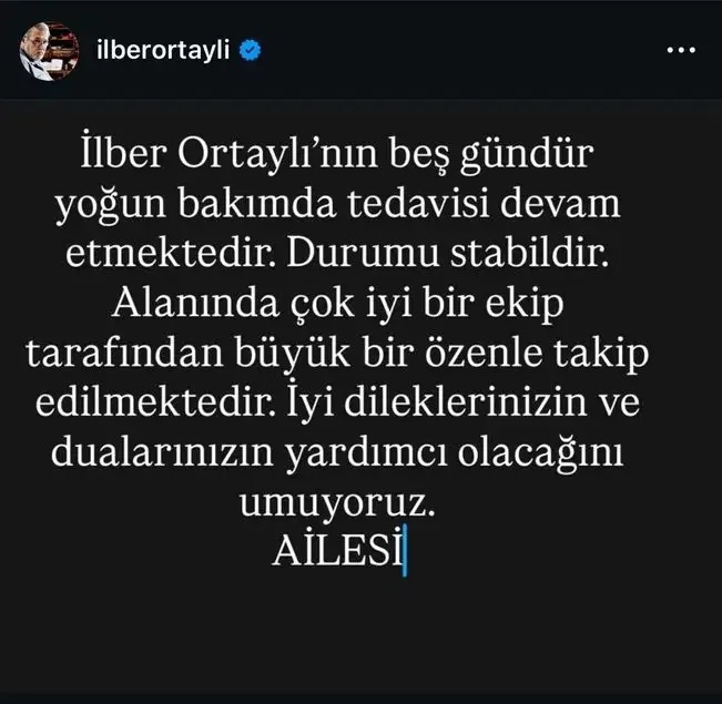 "İlber Ortaylı'nın 5 gündür yoğun bakımda tedavisi devam etmektedir. Durumu stabildir. Alanında çok iyi bir ekip tarafından büyük bir özenle takip edilmektedir. İyi dileklerinizin ve dualarınızın yardımcı olacağını umuyoruz."