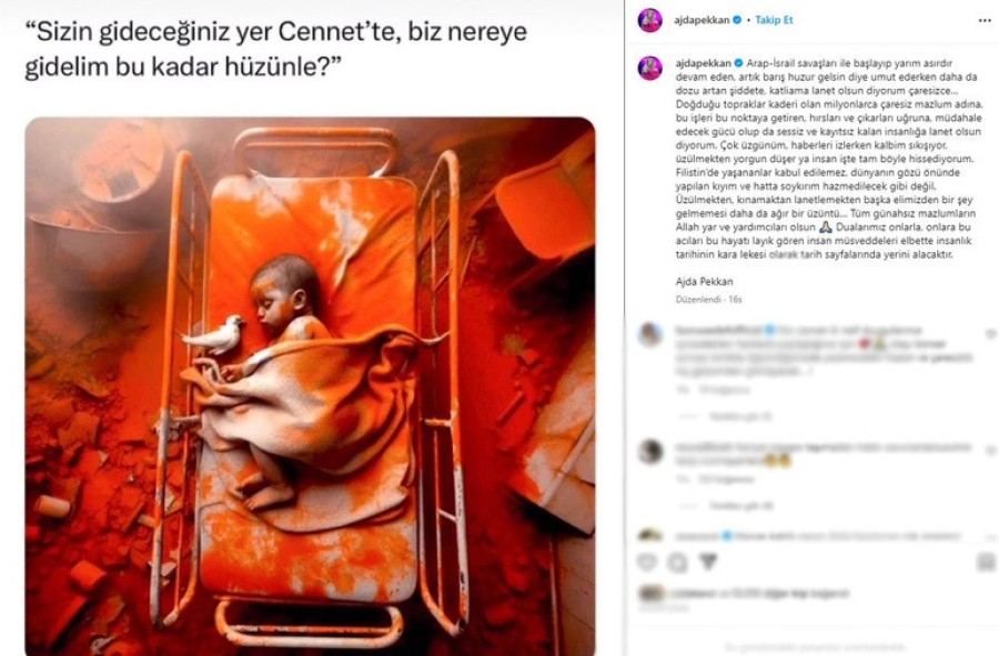 Usta sanatçı Ajda Pekkan sosyal medya hesabından yaptığı paylaşımda Filistin'e kanlı saldırılar düzenleyen İsrail'i lanetledi. Pekkan, "Filistin'de yaşananlar kabul edilemez. Üzülmekten, kınamaktan lanetlemekten başka elimizden bir şey gelmemesi daha da ağır bir üzüntü..." ifadelerini kullandı.