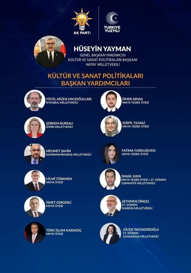AK Parti Kültür ve Sanat Politikaları'ndan Sorumlu Genel Başkan Yardımcısı Hüseyin Yayman'ın başkanlığında çalışmaları yürütecek ekip şöyle: