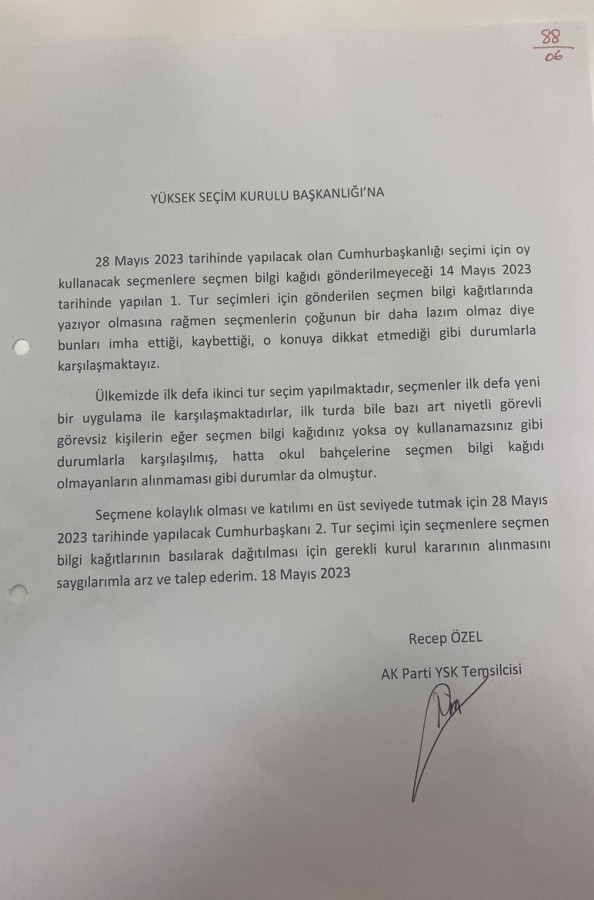 AK Parti YSK Temsilcisi Recep Özel, "YSK müracaatımız üzerine 28 Mayıs 2023 tarihinde yapılacak olan Cumhurbaşkanı 2. Tur seçimleri için tüm seçmenlere seçmen bilgi kağıdının tekrar dağıtılmasına karar vermiştir" açıklamasını yaptı.