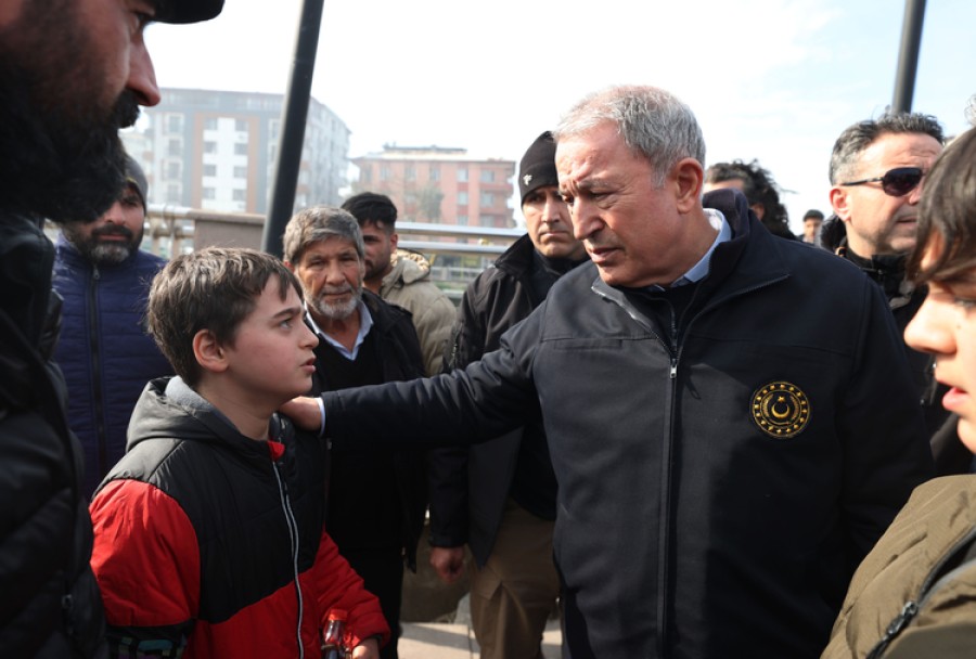 Depremlerin hemen ardından beraberindeki Genelkurmay Başkanı Orgeneral Yaşar Güler ve Kara Kuvvetleri Komutanı Orgeneral Musa Avsever ile Hatay'a gelen Bakan Akar, burada Sağlık Bakanı Fahrettin Koca ile arama kurtarma çalışmalarını yerinde takip ediyor.