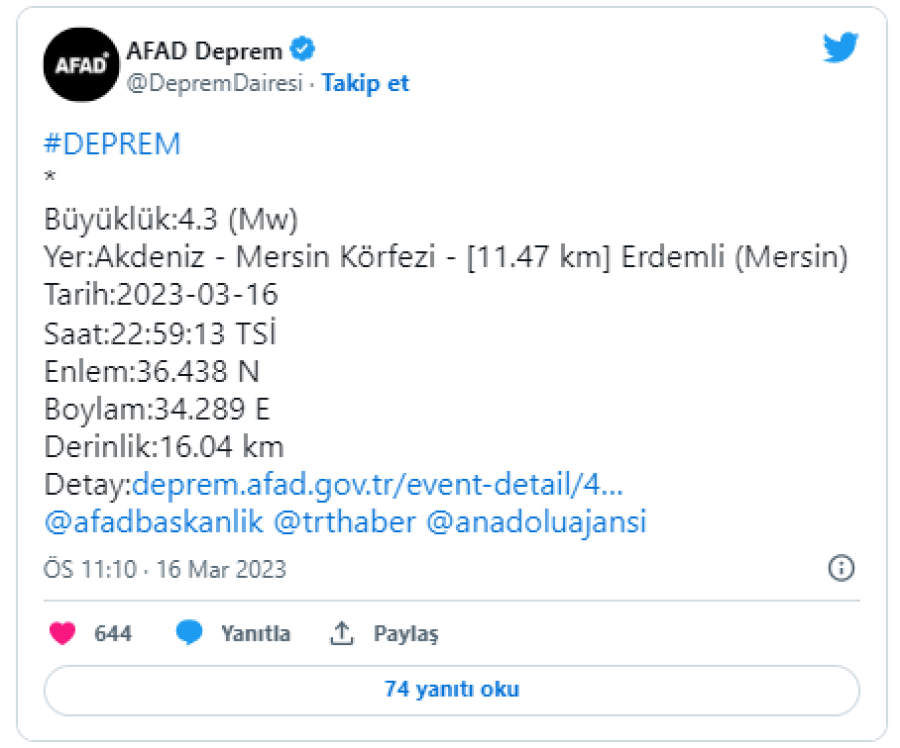 Afet ve Acil Durum Yönetimi Başkanlığının (AFAD) internet sitesinde yer alan bilgiye göre, deprem saat 22.59'da Akdeniz'de Mersin Körfezi'nde gerçekleşti.