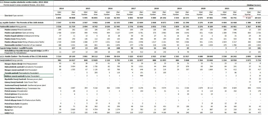 Orman Genel Müdürlüğü'nün verilerine göre, Çevre ve Şehircilik Bakanlığı'nın izniyle, 2012-2022 arasında toplamda 10 milyon metrekare orman alanı nükleer enerji santrali için tahsis edildi. Mersin Akkuyu'ya nükleer santral için verilen orman alanı bin 400 futbol sahası büyüklüğüne karşılık geliyor.