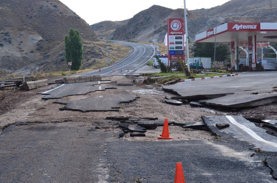 Bir akaryakıt istasyonunun önündeki yol yarıldı.