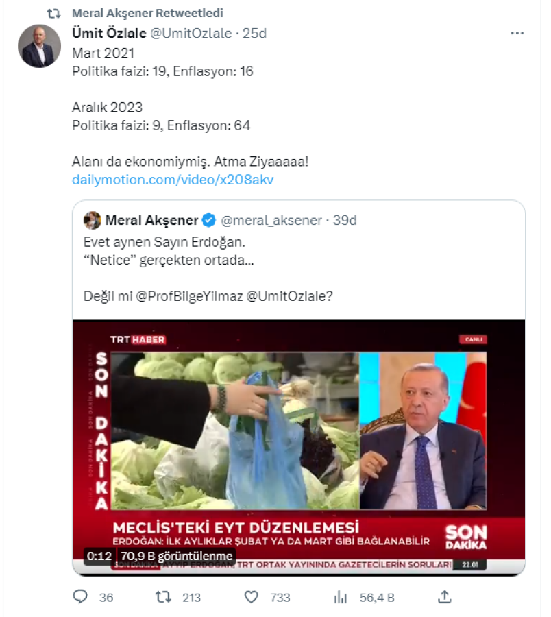 Erdoğan'ın sözlerine yanıt veren Akşener, "Evet aynen Sayın Erdoğan. "Netice" gerçekten ortada..." derken; Özlale de, "Mart 2021 Politika faizi: 19, Enflasyon: 16 Aralık 2023 Politika faizi: 9, Enflasyon: 64 Alanı da ekonomiymiş. Atma Ziyaaaaa!" ifadelerini kullandı.