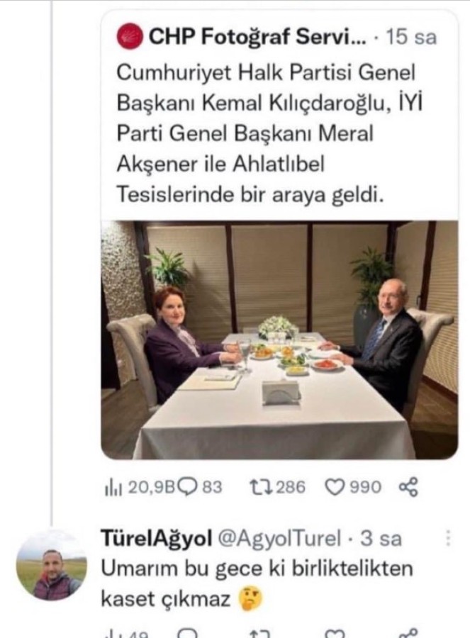 AK Parti'li Tuzla Belediye Meclisi üyesi Türel Ağyol, CHP Genel Başkanı Kemal Kılıçdaroğlu ve İYİ Parti Genel Başkanı Meral Akşener'in salı akşamı Ankara Ahlatlıbel'deki buluşmalarını görüntüleyen fotoğrafı, ağır hakaret içeren bir mesajla Twitter hesabına koydu. Ağyol, Akşener ve Kılıçdaroğlu'nun fotoğrafını, geçmişte bazı siyasetçilerin gizlice kaydedilmiş seks kasetlerine gönderme içeren "Umarım bu geceki birliktelikten kaset çıkmaz" yazısıyla paylaştı.