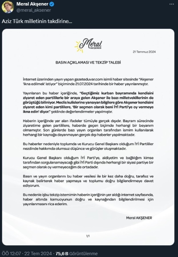 Akşener'in gece yarısı X hesabından yayımladığı açıklamada, aynı zamanda tekzip de talep ederek şu ifadelere yer verdi: