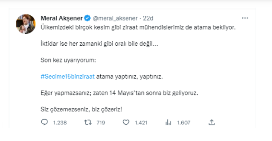 "Ülkemizdeki birçok kesim gibi ziraat mühendislerimiz de atama bekliyor. İktidar ise her zamanki gibi oralı bile değil... Son kez uyarıyorum: #Secime15binziraat atama yaptınız, yaptınız. Eğer yapmazsanız; zaten 14 Mayıs'tan sonra biz geliyoruz. Siz çözemezseniz, biz çözeriz!"